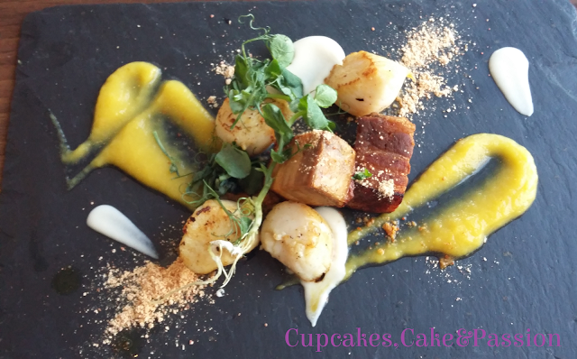 For my starter I ordered the scallops with pork belly, cauliflower puree and mango puree. The presentation was incredible! Art on a plate or slate rather. I'm not fussy on slates for plates but the black against the cauliflower and scallops, it really popped. The saltiness pork against the fishy scallop then partnered with the fruity mango was balanced well with a number of different flavours and textures.